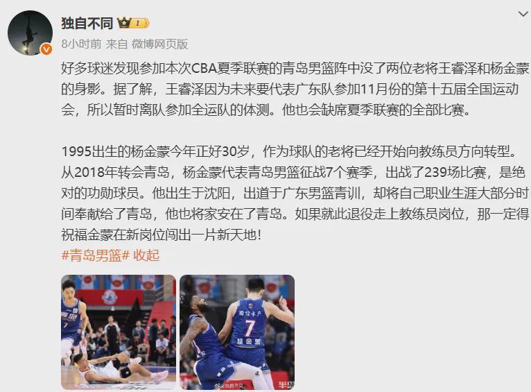 不过很有必要提醒一下,王睿泽只是代表广东队打全运会,不代表他离开青岛队,人家正在执行的合同(C类)明年夏天才会到期,很有望获得一份D类顶薪续约合同,没有任何主动离队或被交易的理由。